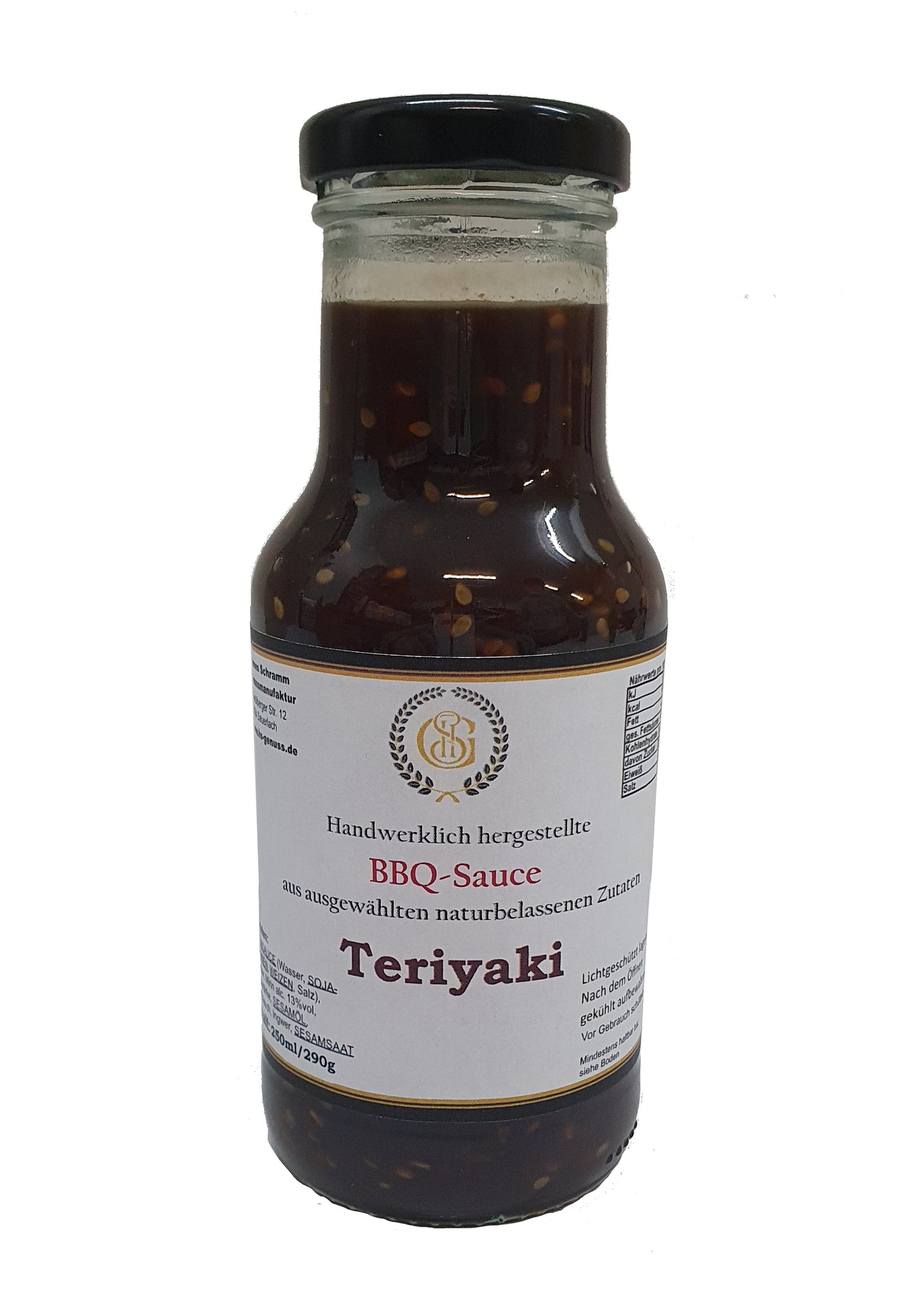 Zutaten: Sojasauce (Wasser, Sojabohnen, Weizen, Salz), Zucker, Mirin alc. 13%vol, Maisstärke, Sesamöl geröstet, Knoblauch, Ingwer, Sesamsaat geröstet